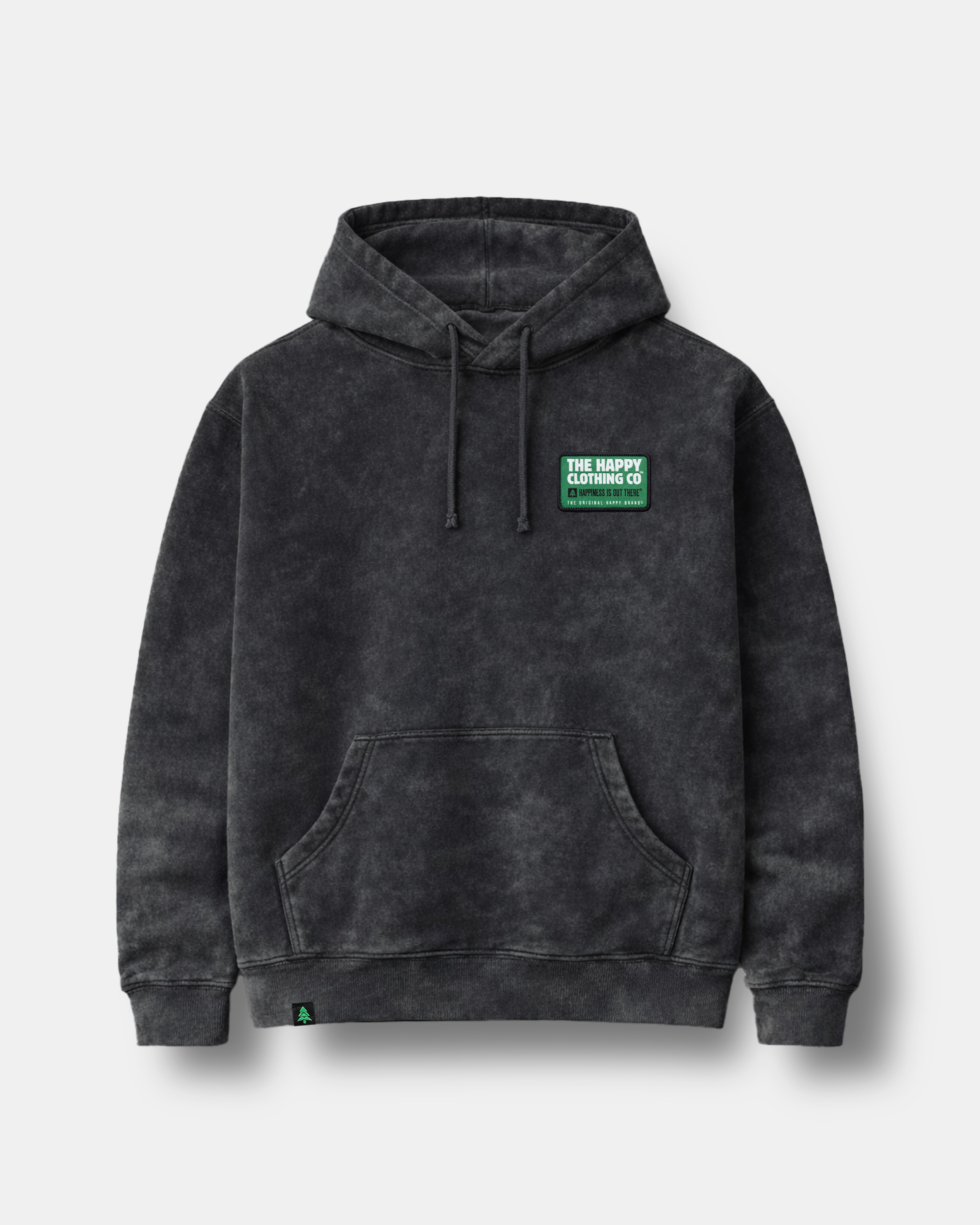 A mineral-washed hoodie to match the look of stone 🪨 Hand sewn onto the left chest is our new vintage-inspired woven patch. It reads "The Happy Clothing Co. Happiness Is Out There. The Original Happy Brand."