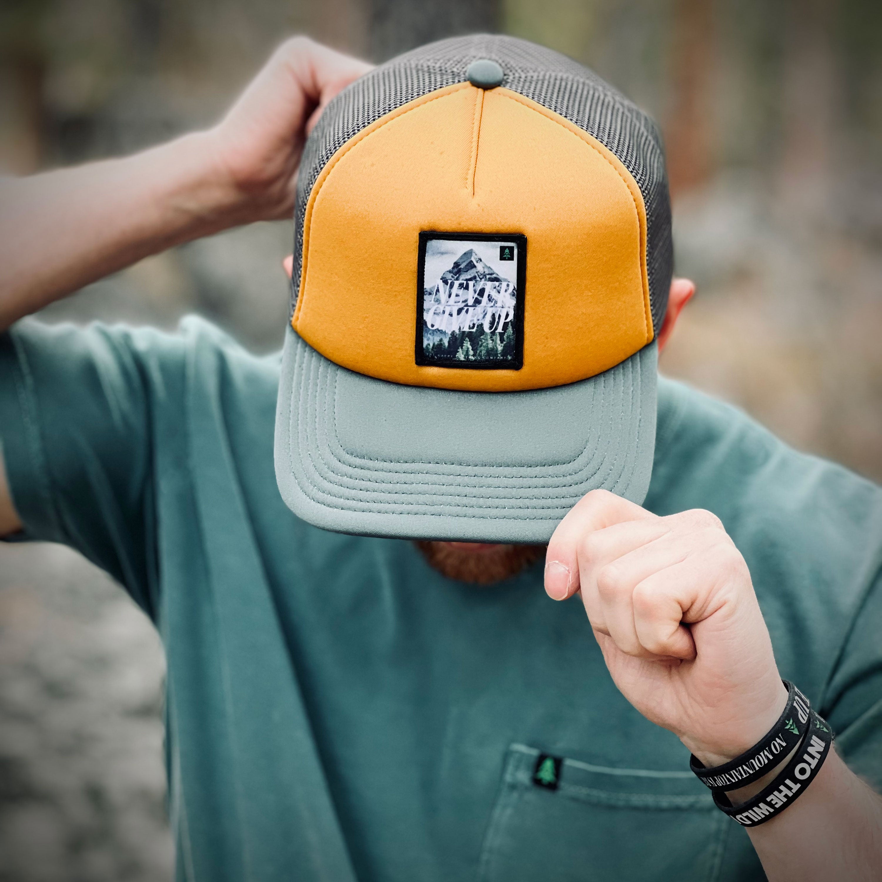 NO MOUNTAINTOP IS BEYOND YOUR REACH IF YOU NEVER GIVE UP... KEEP CLIMBING! This is a 5 panel, mid-profile hat, with a printed patch sewn on to the front panel, and an adjustable plastic closure.